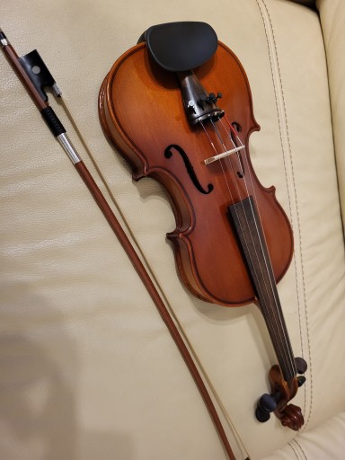 Skrzypce 1/4 wraz z używanym futerałem i nowym smyczkiem. Skrzypce mają wklejką Medio Fino (wklejka wewnątrz), wg mnie to skrzypce czeskie. Skrzypce mają swoje lata, ale są w idealnym stanie technicznym. Mają nowy podbródek antyalergiczny Wittner, strunnik palisandrowy z 4 mikrostroikami Wittner. Dźwięk bardzo ładny, ciepły. Nagranie mogę wysłać przez whatsapp. Smyczek jest całkowicie nowy. Futerał prostokątny, całkowicie nowy.