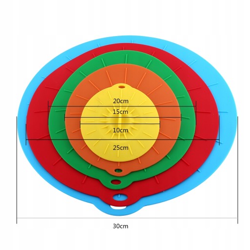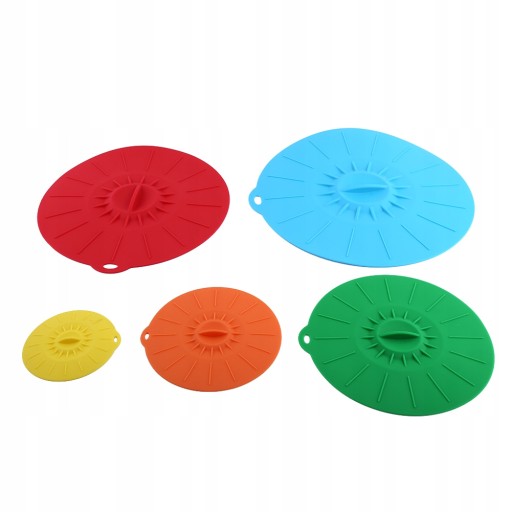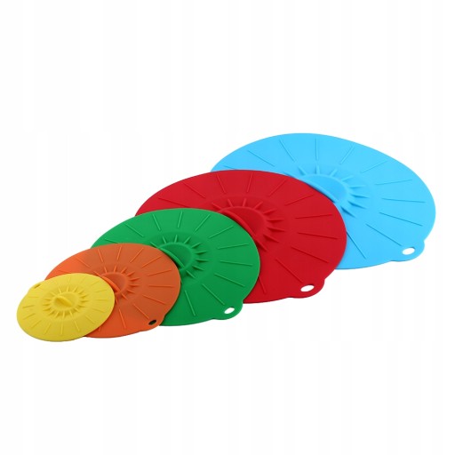 - 5 różnych rozmiarów pokrywek jest używanych do różnych rozmiarów naczyń na żywność, takich jak kubki, miski i garnki.