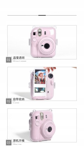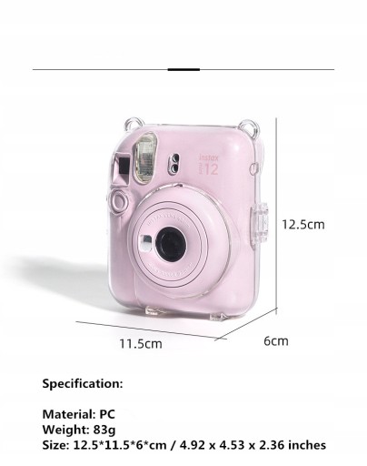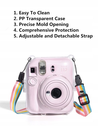 Zaprojektowany tak, aby był kompatybilny tylko z aparatem do filmów natychmiastowych Fujifilm Instax Mini 12. Krystalicznie przejrzysta konstrukcja podkreśla naturalne piękno i elegancki smak aparatu. Lista paczek: 1x przezroczysty futerał na aparat z paskiem na ramię (aparat nie jest dołączony)
