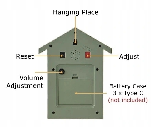 1 . Przekręć godzinę połączenia, aby włączyć się do lokalnego czasu standardowego, prawidłowo włóż 3 baterie typu C, naciśnij raz przycisk ADJUST z tyłu produktu, uruchom się okno, uruchom się Kukułka i zgłosi 6 razy „Cuckoo” (co oznacza, że godzina to 6 rano ) Jeśli przycisk ADJUST zostanie na raz, godzina zwiększy się o 1 godzinę.
