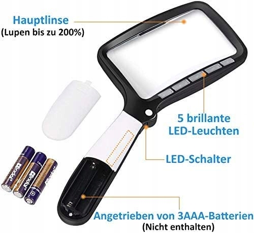 Lupa z 5 diodami LED: lupa może pomóc w wykonywaniu różnych zadań w nocy lub w ciemnych miejscach. Ta lupa do czytania ze światłem dla seniorów jest zasilana 3 bateriami AAA (brak w zestawie). Idealna do wyświetlania bardzo drobnych szczegółów, takich jak książki, gazety , czasopisma, instrukcje obsługi, mapy, elektronika, miniatury, biżuteria, butelki na pigułki itp.