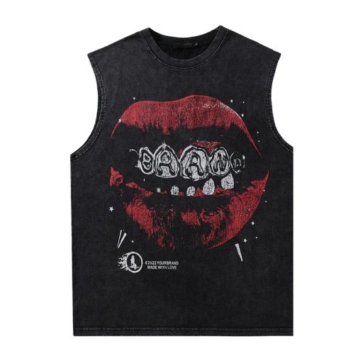 Lip Print Pattern Washed T Shirt Vintage Loose Tank Top Casual Sleeveless Cotton Tshirt Hip Hop Streetwear Oversize Tops Vest