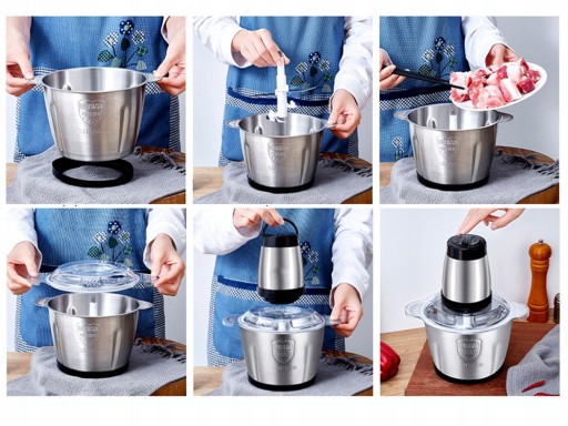 2 prędkości 220V ze stali nierdzewnej 2L pojemność elektryczny Chopper maszynka do mielenia mięsa Mincer robot kuchenny krajalnica Funkcja: Kompaktowy korpus ze stali nierdzewnej, ładnie wyglądający, łatwy do mycia i obsługi. Posiada metalowy, trwały system sprzęgania napędowego. Podwójne ostrze ze stali nierdzewnej i antypoślizgowe maty gumowe Opcja wysokiej/niskiej dwóch prędkości dla szerokiej gamy różnych składników. Nadaje się do: mięsa, owoców, orzeszków ziemnych, orzecha włoskiego, fasoli i tak dalej. Specyfikacja: Materiał: Stal nierdzewna Pojemność: 2L Moc znamionowa: 200-300 W. Napięcie znamionowe: 220 V. Częstotliwość znamionowa: 50 Hz Prędkość: około 6000-22000 obr./min Ostrze: podwójne ostrze ze stali nierdzewnej Prędkość: wysoka / niska 2 prędkości Uwaga: proszę używać produktu zgodnie z czasem pracy w instrukcji Maszyna może pracować tylko wtedy, gdy podstawa silnika jest prawidłowo i szczelnie zainstalowana na pokrywie miski! Zamontuj dolną podkładkę antypoślizgową Dopasuj głowicę tnącą do dolnego słupka i zainstaluj ją Włożyć pokrojone mięso do miski Zakryj górną pokrywę Dopasuj głowicę maszyny do gniazda karty i umieść ją Kliknij przełącznik, aby uruchomić mięso