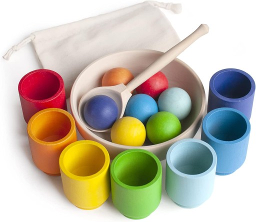 Zawiera 12 drewnianych kulek, 12 drewnianych kubków, drewnianą miskę i drewnianą łyżkę
