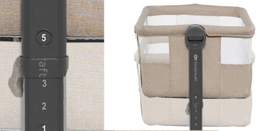 Wysokość łóżeczka jest regulowana, co w połączeniu z uniwersalnym systemem mocowania pozwala dostawić łóżeczko do większości łóżek rodziców. W Neste Up 2 możemy zmienić wysokość łóżeczka w aż 5 poziomach.