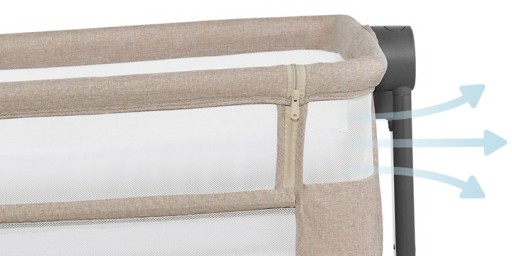 Konstrukcja łóżeczka Kinderkraft Neste Up 2 posiada wentylowane ścianki, dzięki czemu nie tylko zapewnia widoczność, ale również chroni malucha przed dyskomfortem i przegrzaniem w ciepłe dni.