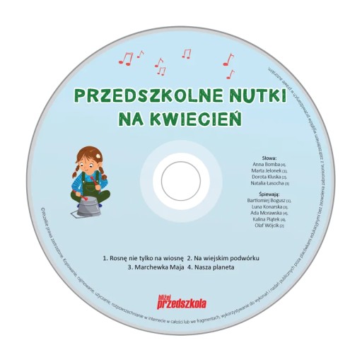 - płytę CD „Przedszkolne nutki na kwiecień” z podkładami i piosenkami w wersji wokalnej i instrumentalnej skorelowanymi z treścią miesięcznika;
