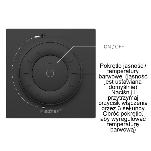Pilot K3 umożliwia bezstopniowe ściemnianie i rozjaśnianie, oraz ustawienie temperatury barwowej w zakresie 2700-6500K, Wystarczy obrócić pokrętło na pilocie, aby cieszyć się komfortowymi efektami świetlnymi. Pilot mocowany jest za pomocą magnesu, do prostokątnej podstawki, którą możemy np. zamocować do ściany za pomocą wkrętów lub taśmy klejącej.
