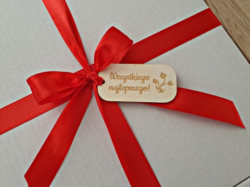 Usługa jest dodatkowo płatna i obejmuje zapakowanie produktu do białego pudełka z wysokogatunkowej tektury z beżowym wypełniaczem. Całość opakowania ozdobi czerwona wstążka z drewnianym bilecikiem z napisem "Wszystkiego najlepszego!"