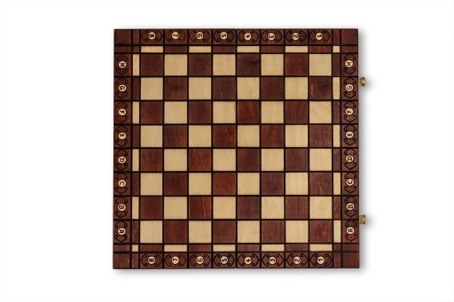 Rozłożona szachownica ma wymiary 42x42x2,5cm, po zamknięciu stanowi pudełko, w którym można przechowywać figury szachowe.