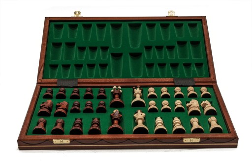 Komplet stanowi kaseta z planszą szachową, zestaw figur szachowych w kolorach białym i mahoniowym po 16 elementów w każdym.