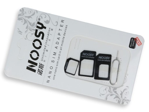 Adaptery do kart SIM firmy Noosy - wysokiej jakości produkt, dzięki któremu można użyć kartę w każdym telefonie - SIM, Micro SIM, Nano Sim. W zestawie kluczyk do otwierania szufladki SIM