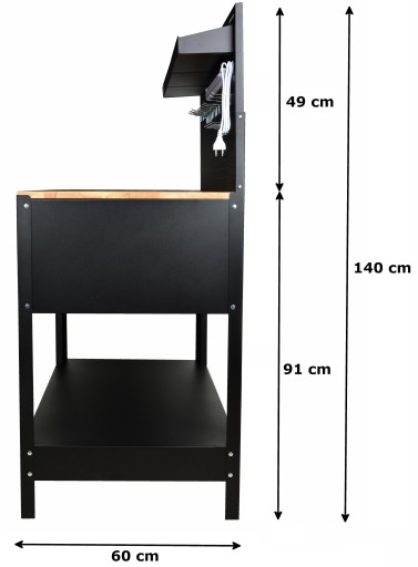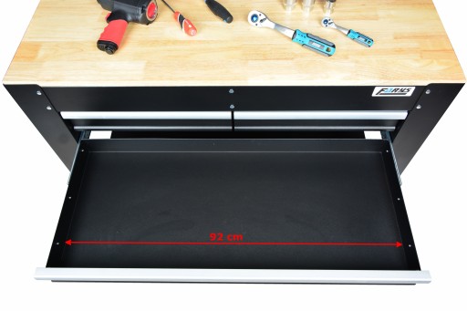 Warto dodać, że szafka warsztatowa z drewnianym blatem poza szufladami posiada także dolną półkę, która może być wykorzystana do przechowywania dużych przedmiotów. Na tylnej ściance można przy pomocy dołączonych do zestawu haczyków zawiesić najpotrzebniejsze narzędzia, a lampa LED, znajdująca się pod 3 półkami, oświetli obszar roboczy.Dodatkowym atutem jest znajdujące się z boku szafki trzy gniazdka elektryczne, oraz 2 gniazdka USB z możliwością odcięcia prądu jednym przyciskiem.