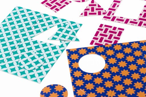 Zestaw pobudza ciekawość i uczy logicznego myślenia. Układanka składa się z tekturowych kart z kontrastującymi wzorami, w których wycięte są cztery figury geometryczne (koło, kwadrat, prostokąt i trójkąt). Zadaniem malucha jest precyzyjne dopasowanie kształtu w odpowiednie miejsce tak, by zarówno figura, jak i wzór tworzyły spójną całość.