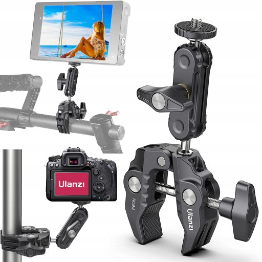 Głowica idealnie nadaje się do mocowania monitorów poglądowych LCD przy aparatach, kamerach, gimbalach, statywach i innych urządzeniach w standardowym gwincie mocującym 1/4''. Głowica posiada również płynną regulację położenia w zakresie 360 stopni zarówno w poziomie jak i pionie.