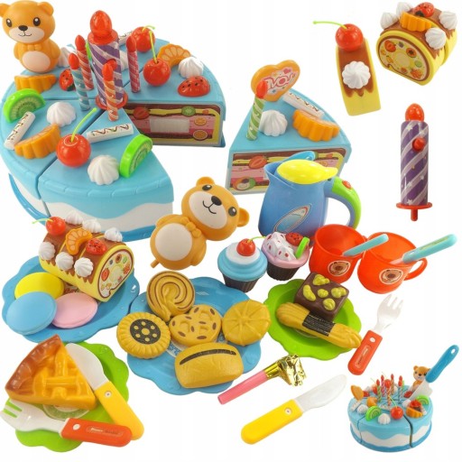 W zabawkowy tort z elementami został wykonany na wzór prawdziwych produktów, więc dziecko podczas zabawy poczuje się jak w prawdziwej kuchni. Tort, rolada, babeczki, nożyk, i wiele produktów spożywczych oraz wesoła kolorystyka zachęca dziecko do długiej zabawy.