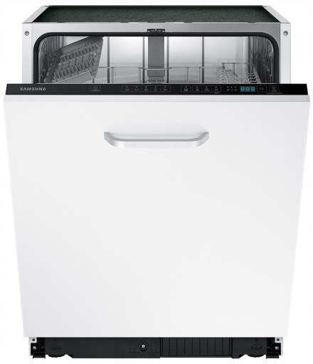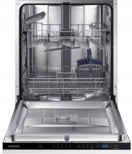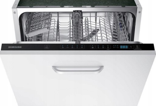 Elegancka zmywarka do zabudowy firmy Samsung z funkcją dezynfekcji i niebieskim wyświetlaczem LED.