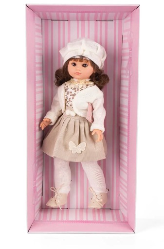 Ta lalka to piękna Lalka prosto z gorącej Hiszpanii. To idealna zabawka dla małej miłośniczki mody i lalek. Lalka ma długie włosy, które można czesać. Fany ma na sobie eleganckie, ręcznie uszyte ubranie - różowy sweter, spódniczkę, bluzeczkę, grube rajstopy i wiązane buciki. Lalka jest wykonana z miękkiej gumy z dużą starannością i dbałością o szczegóły. Ma piękne oczy, sztuczne rzęsy i pachnie wanilią. Lalka jest zapakowana w różowe pudełko z plastikowym okienkiem, co czyni ją doskonałym prezentem dla dziewczynki. To prawdziwa i oryginalna lalka hiszpańska - gwarancja jakości.