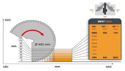 - Minimalna długość cięcia przy pile 400mm: 1060 x 125 wys.mm