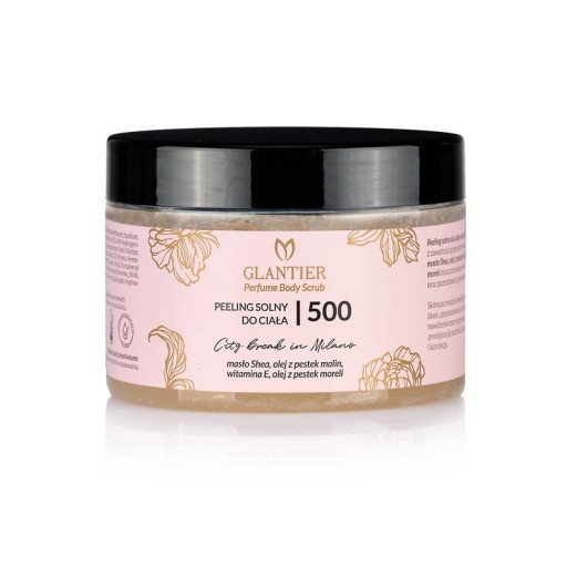 Porcja dobroczynnych dla ciała i zmysłów właściwości perfumowanego peelingu do ciała Glantier 500 została zamknięta w praktycznym odkręcanym opakowaniu o pojemności 300 g.