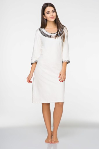 Ekskluzywna koszula damska z 3/4 rękawem i długością do kolan, w subtelnym kolorze ecru oraz wykończeniem na dekolcie i rękawach w nietuzinkowym wzorze.