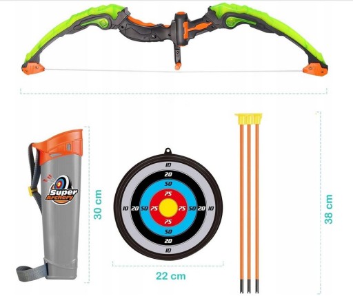 - Wymiary: Tarcza: Średnica 23,5 cm; Kołczan: 30 x 10 x 4,3 cm (wys. x szer. x gł.); Łuk: 63 x 13 x 3 cm; Strzałki: Długość ok. 41,5 cm.