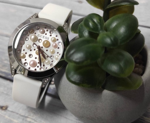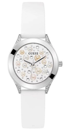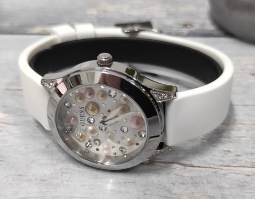Damski zegarek fashion modowy GUESS z mieniącą się tarczą. Stalowa koperta iw kolorze srebrnym zdobiona cyrkoniami, tarcza z efektem 3D, biały silikonowy pasek. Zegarek damski wodoszczelny