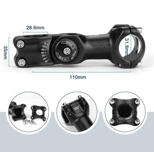 🚲🚲 Rozmiar: 0-60° 31,8 × 110 mm. Średnica środka kierownicy: 31,8 mm (1-1/4 cala); średnica pionu: 28,6 mm (1-1/8 cala); długość: 110 mm; waga: 280 g; stopień: 0-60 ° regulowany, wybierz odpowiedni model dla swoich wymagań.