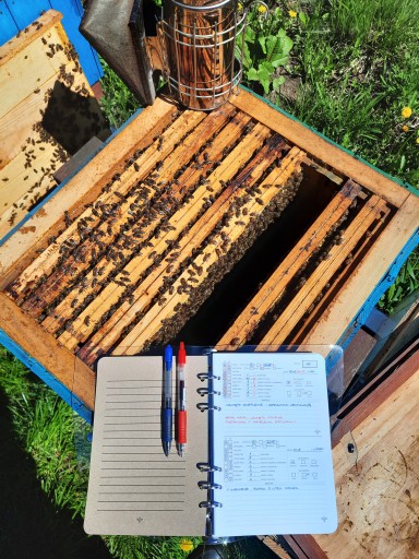 Przeglądy uli bywają praco oraz czasochłonne, aby ułatwić sobie niewątpliwie trudne zadanie jakim jest opieka nad rodziną pszczelą konieczne jest prowadzenie skrupulatnych notatek, które pozwolą nam odświeżyć pamięć na temat konkretnej rodziny. Notatki prowadzić można na wiele sposobów, m.in. w zeszytach, na luźnych kartach lub fiszkach trzymanych w ulu oraz w różnego rodzaju notesach i skoroszytach. Żaden z tych sposobów nie jest w pełni praktyczny, mają wady oraz są czasochłonne. W tym celu, po przetestowaniu powyższych sposobów został opracowany oferowany na niniejszej aukcji Notes pasieczny.
