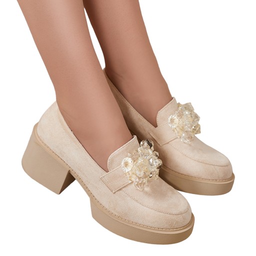 Przepiękne damskie półbuty typu mokasyny na słupku. Model w tylu casual i jest wykonany ze skóry ekologicznej zamszowej i wkładki z eko skóry. Nosek zaokrąglony, zdobiony kryształkami. Idealna baza dla wielu codziennych looków!