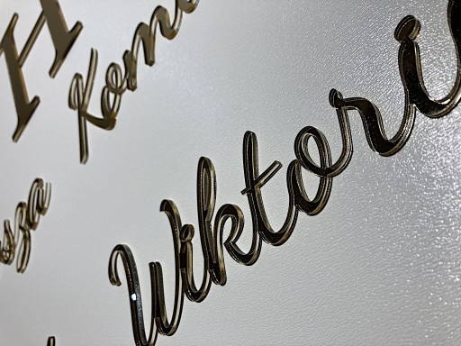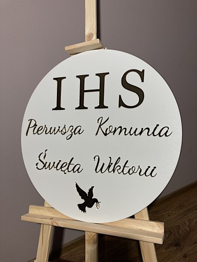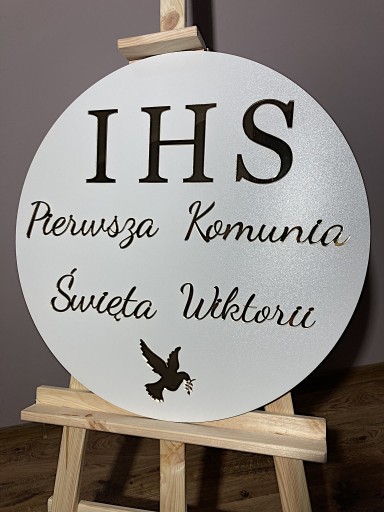 Dekoracja komunijna, która doda elegancji i uroku uroczystości. Białe koło z wyjątkowym napisem oraz imieniem wykonanym w złotym lustrze to doskonała tablica powitalna dla gości jak i ozdoba sali. Wyjątkowy design, który zachwyci wszystkich uczestników. Piękny dodatek do przyjęcia komunijnego, który sprawi, że ten dzień będzie jeszcze bardziej niezapomniany.