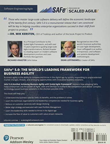 SAFe® 5.0: The World's Leading Framework for Business Agility "Those who master large-scale software delivery will define the economic landscape of the twenty-first century. SAFe 5.0 is a monumental release that I am convinced will be key in helping countless enterprise organizations succeed in their shift from project to product." –Dr. Mik Kersten, CEO of Tasktop and author of the book Project to Product Business agility is the ability to compete and thrive in the digital age by quickly responding to unprecedented market changes, threats, and emerging opportunities with innovative business solutions. SAFe® 5.0 Distilled: Achieving Business Agility with Scaled Agile Framework® explains how adopting SAFe helps enterprises use the power of Agile, Lean, and DevOps to outflank the competition and deliver complex, technology-based business solutions in the shortest possible time. This book will help you Understand the business case for SAFe: its benefits, and the problems it solves Learn the technical, organizational and leadership competencies needed for business agility Refocus on customer centricity with design thinking Better align strategy and execution with Lean Portfolio Management Learn the leadership skills needed to thrive in the digital age Increase the flow of value to customers with value stream networks Register your book for convenient access to downloads, updates, and/or corrections as they become available. See inside book for details.