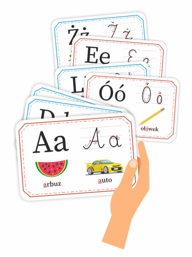 Literki na fiszkach są zapisane stylem drukowanym oraz pisanym.