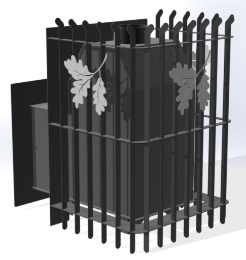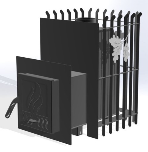 Zestaw zawiera piec opalany drewnem, zestaw kominowy i blachy dekoracyjne.