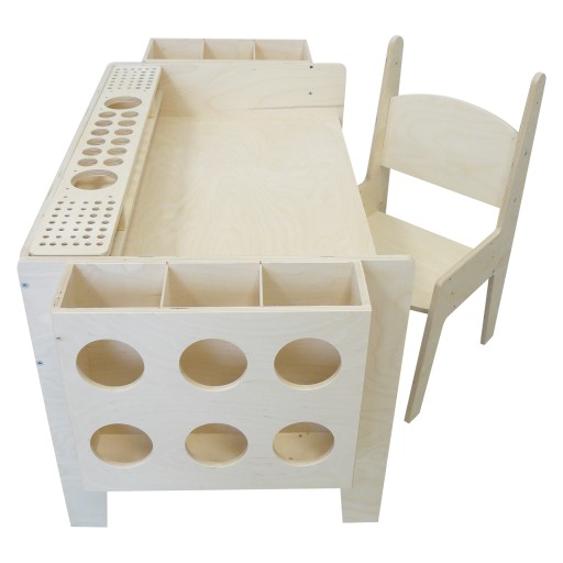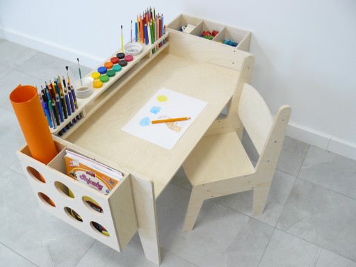 Komplet składa się ze stolika, krzesełka oraz trzech organizerów. Wykonany został ze sklejki nie pokrytej lakierem. Zarówno stolik jak i krzesełko posiadają trzy poziomy regulacji: niemowlak, maluch i starszak. W zestawie znajdują się organizery, które przeznaczone są na farby, pędzelki, kubki na wodę, kredki, flamastry i długopisy, kartki papieru oraz klocki. Dzięki nim nie trzeba sięgać za każdym razem do szuflady czy piórnika - wszystko jest dostępne w zasięgu ręki. Nasze sortery mogą być wykorzystywane podczas zabawy - rysowania lub malowania przez dzieci. Pojemniki są stabilne i praktyczne w użytkowaniu, a ich solidne wykonanie pozwoli na długotrwałe używanie. Każdą kredkę można włożyć do osobnego otworu, dzięki czemu dziecko z łatwością wyjmie i włoży kredkę na swoje miejsce.Komplet doskonale uzupełni umeblowanie pokoiku Twojego dziecka sprawi, że jego wnętrze stanie się ciepłe i radosne. Mebelki są funkcjonalne i nie zajmują dużo miejsca. Krzesełko jest bardzo wygodne, a stolik zapewnia wystarczającą ilość miejsca do zabawy. Twoja pociecha odnajdzie przy nim doskonałe miejsce do zabawy, rysowania i malowania, a nawet spożywania posiłków.
