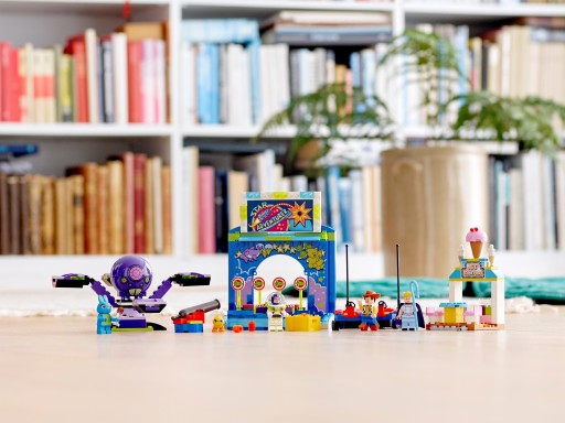 Wprowadź swojego malucha w świat karnawałowych emocji z filmu „Toy Story” wytwórni Disney Pixar w zestawie LEGO 4+ 10770 Karnawałowe szaleństwo Chudego i Buzza! Ten pełen akcji zestaw konstrukcyjny został zaprojektowany z myślą o przedszkolakach i małych dzieciach. Zawiera kolorową strzelnicę karnawałową z dużym szyldem i laserową armatką oraz specjalną podstawką startową, która pozwala nawet zupełnym nowicjuszom poczuć dumę z samodzielnego złożenia budynków, pojazdów i nie tylko. W tym ciekawym zestawie dla przedszkolaków znajdziesz również karuzelę Terrorantulę z ruchomymi ramionami, dwa samochodziki z podwoziami startowymi oraz lodziarnię wyposażoną w kasę, stolik, ławki oraz szyld. Zestaw zawiera proste instrukcje, które pomogą zacząć budowanie i zabawę, a młodym miłośnikom karnawału wyjaśnią cel poszczególnych etapów budowania. Dzięki temu dzieci rozwijają wyobraźnię i pewność siebie, poznając świat budowania z klocków LEGO w znajomej scenerii z filmów „Toy Story”. W komplecie są minifigurki Chudego, Buzza Astrala i Bou oraz figurki LEGO Kaczuszki i Króliczka.