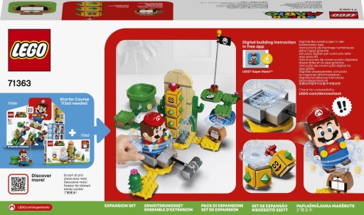 - Zestaw nie wymaga baterii — aby zabawa nabrała tempa, wystarczy połączyć go z zestawem Przygody z Mario — poziom startowy. Zawiera jasno napisane instrukcje, dzięki czemu dzieci będą budować pewnie i bez pomocy.