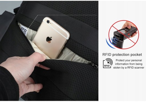 Plecak posiada kieszeń z wbudowanym systemem RFID. Pozwoli to bezpiecznie przechowywać portfel bez obawy, że ktoś skopiuje dane z naszej karty kredytowej.