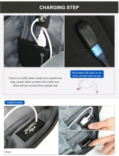 Plecak wyposażony jest w gniazdo usb, dzięki czemu nie ma konieczności wyciągania power banka z plecaka, aby naładować telefon. Uwaga, power bank nie jest częścią zestawu.