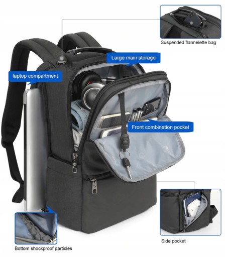 Plecak posiada osobną kieszń na laptopa, pojemną komorę główną oraz przednią kieszeń z organizerem. Plecak jest bardzo pojemny, a wiele kieszonek sprawia, że można przenosić w nim wszystko czego potrzebujemy.