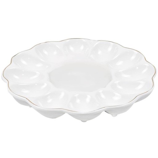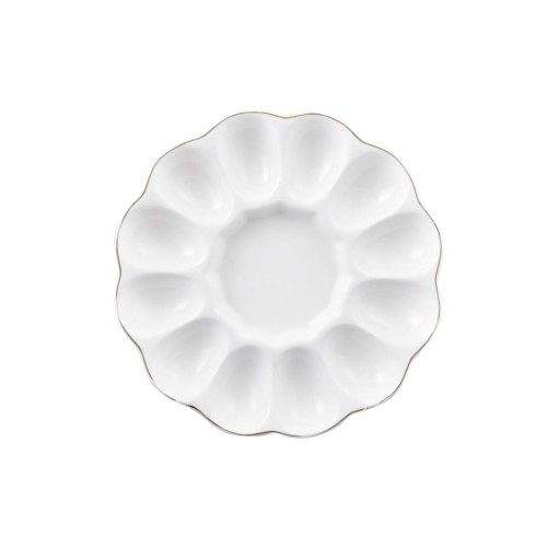 Talerz do jajek o średnicy 21 cm, w kolorze bieli połączonej ze złotem która wygląda bardzo elegancko.