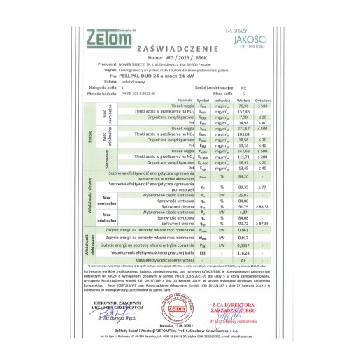 Parametry techniczne kotła PELLPAL DUO moc 24 kW