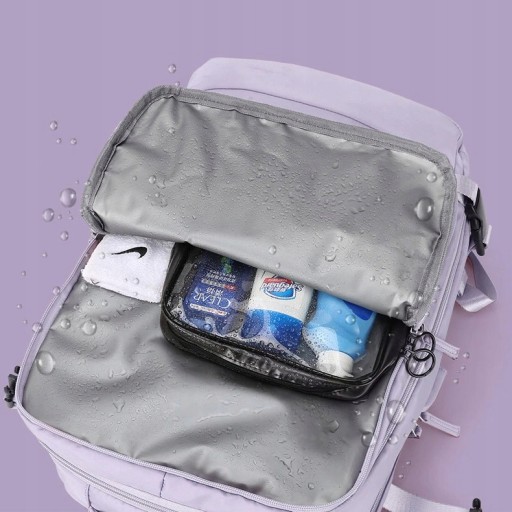 Plecak wyposażony jest w kieszeń, której podszewka wykonana jest z wodoodpornego i łatwego w czyszczeniu materiału. Kosmetyki będą oddzielone od ubrań, więc nie ma obawy, że podczas podróży spotka nas niemiła niespodzianka.