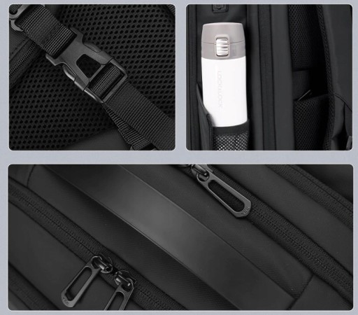 Dwukomorowy plecak na laptopa marki FRN o symbolu FRN8038 został wykonany z wodoodpornych i wytrzymałych materiałów – oxford i PVC. Komora z przodu plecaka otwierana jest na płasko, jak walizka. Znajduje się tutaj miejsce na zapakowanie ubrań, które odseparowane jest siatkową przegrodą, oraz dwie duże kieszenie. W drugiej komorze z tyłu plecaka znajduje się dedykowana, miękka kieszeń na laptopa w rozmiarze do 17,3" zapinana na rzep oraz sześć kieszonek na akcesoria. Z przodu plecaka znajduje się kieszeń na podręczne rzeczy z kieszonkami na akcesoria i długopisy oraz przypinką do kluczy, oraz druga mniejsza kieszeń z wodoodpornym zamkiem. Po bokach plecaka umieszczono kieszenie na napój lub parasolkę zapinane na zamek. Z lewej strony znajduje się zewnętrzne gniazdo USB, dzięki czemu nie ma konieczności wyciągania power banka z plecaka, aby naładować telefon lub inne przenośne urządzenie. Szelki plecaka o ergonomicznym kształcie oraz tylna ściana plecaka wyłożone są grubymi, oddychającymi gąbkami, dzięki czemu jest on wygodny przy dłuższym noszeniu. Plecak posiada również pas piersiowy, którym można spiąć szelki, aby lepiej rozłożyć ciężar przy maksymalnym zapakowaniu plecaka. Na tylnej ścianie umieszczono szeroki pas, dzięki któremu można założyć plecak na rączkę torby lotniczej, oraz bezpieczną kieszeń np. na telefon lub portfel. Plecak posiada uchwyt służący do przenoszenia plecaka w ręce. Niebywałą zaletą tego plecaka jest możliwość powiększenia go o dodatkowe 8cm (12l) poprzez rozpięcie dodatkowego zamka, biegnącego po całym obwodzie plecaka.