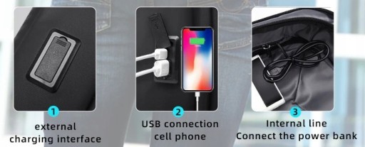 Plecak wyposażony jest w gniazdo USB, dzięki czemu nie ma konieczności wyciągania power banka z plecaka, aby naładować telefon. Uwaga, power bank nie jest częścią zestawu.