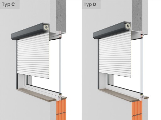 - montaż na ścianie budynku (typ C) – ten sposób montażu zakłada zamocowanie skrzyni oraz prowadnic rolety bezpośrednio na zewnętrznej ścianie budynku, dostęp do klapy rewizyjnej od dołu skrzyni,
