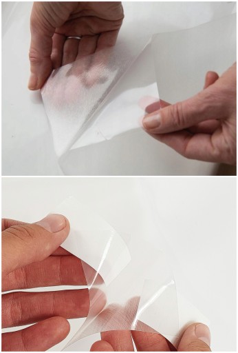 Nie widać tego na pierwszy rzut oka, ale z tyłu statycznej folii okiennej znajduje się cienka, folia ochronna. Aby folia okienna trzymała się na powierzchni szkła dzięki właściwościom statycznym, trzeba usunąć tę osłonkę, która znajduje się z tyłu folii.