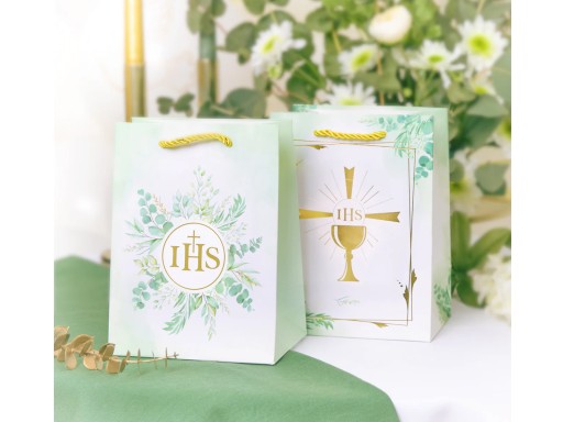 Torebka na prezenty z grafiką Kielicha IHS w kolorze złotym. Idealna na prezenty z okazji Pierwszej Komunii. Doda stylu i uroku umieszczonym w niej upominkom. Może zostać wykorzystana jako ozdoba podczas tematycznej sesji zdjęciowej.