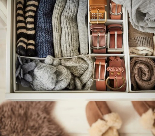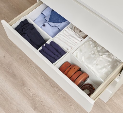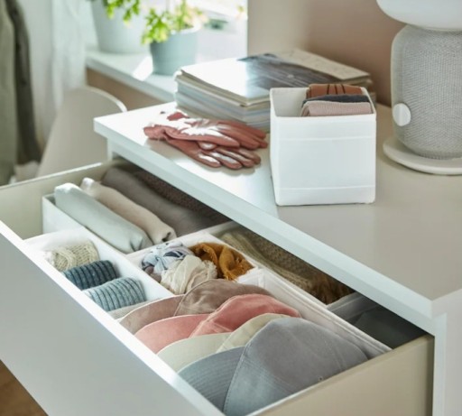 - Zestaw pojemników pomaga uporządkować skarpetki, paski czy biżuterię w szafie lub komodzie.