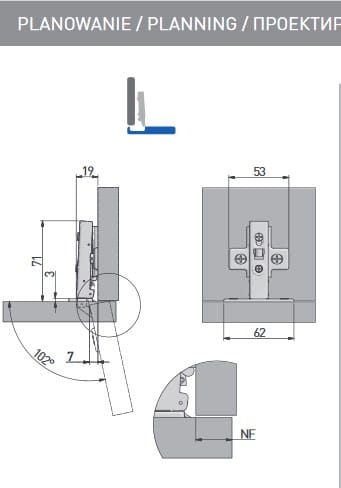 - Cechy produktu: Zawias hydrauliczny z cichym domykiem, Systemem łatwego wypięcia z prowadnika CLIP-ON, Nowoczesny design, Certyfikat 80 000 cykli